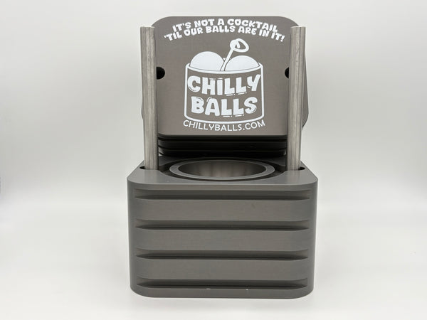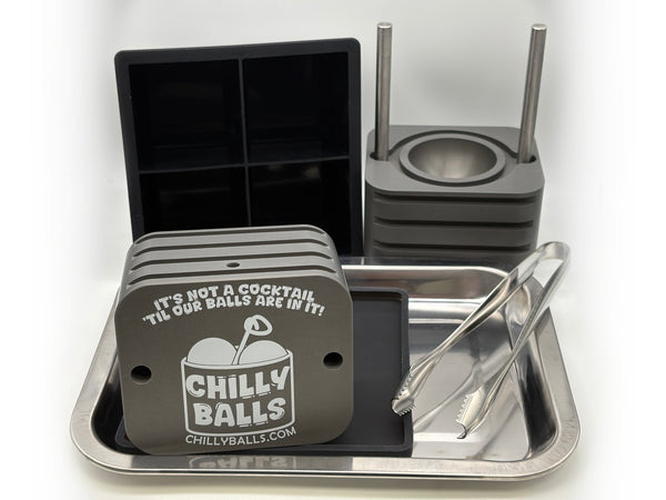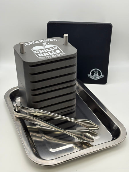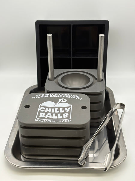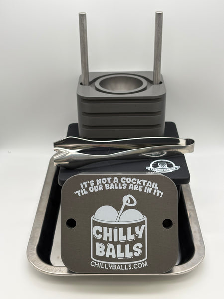 Hot off the presses is the Chilly Balls Classic "Ball" ice press kit. This press will create an ice sphere that will fit in any common tumbler glass. Perfect with your favorite cocktail, whiskey, or any other adult beverage. Made out of aircraft quality 6061 billet aluminum and food-safe coated, our press is made to the highest of standards. The kit includes the following: